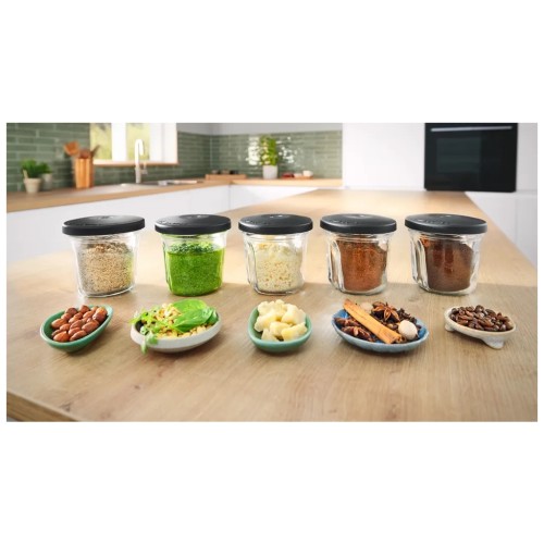 Набір Bosch TastyMoments MUZS68TM — це універсальне рішення 5-в-1, яке поєднує функції блендера, млинка, подрібнювача, контейнера для зберігання та контейнера ToGo для зручного транспортування. Завдяки міцним лезам із нержавіючої сталі набір легко справляється навіть із твердими інгредієнтами — кавовими зернами, сиром, горіхами чи льодом. Це дозволяє швидко готувати свіжі смузі, соуси, подрібнювати спеції або робити заготовки для страв.