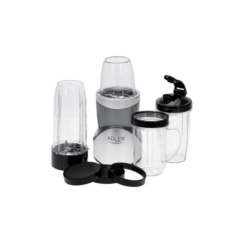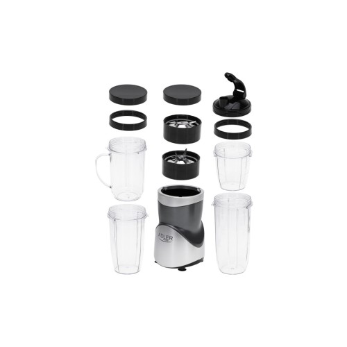 Фітнес-блендер Adler AD 4084 постачається у комплекті з трьома скляними ємностями різного об’єму - 700 мл, 500 мл та 300 мл, а також чашкою з ручкою об’ємом 500 мл. До складу комплекту постачання також входять чотири кришки, одна з яких оснащена отвором для пиття, який закривається.