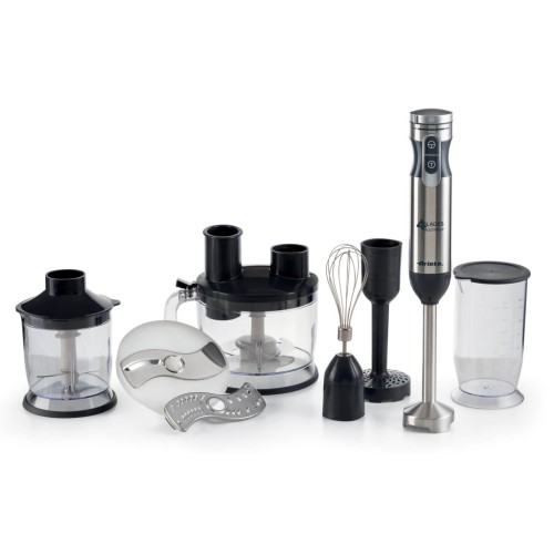 Занурювальний блендер; Потужність - 1000 Вт; Кількість швидкостей - 11; частини - Нержавіюча сталь; Матеріал чаші - Пластик; Обсяг міні-подрібнювача - 0.5 л; Функції - Турборежим; - 700 мл; Комплектація - Блендер, Великий подрібнювач, Вінчик для збивання, Млинок, Мірний стакан з кришкою, Міні-подрібнювач; Колір - Нержавіюча сталь, Чорний; Обсяг великого подрібнювача - 2 л; Розміри, мм - 65х65х410