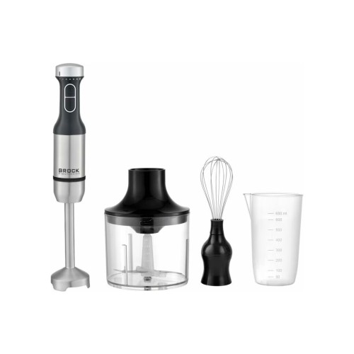 Занурювальний блендер, потужність 700 Вт, 2 швидкості, занурювальна частина з нерж. сталі, леза з нерж. сталі, подрібнювач - 500 мл, мірна склянка -650 мл, віночок для збивання, двигун постійного струму.