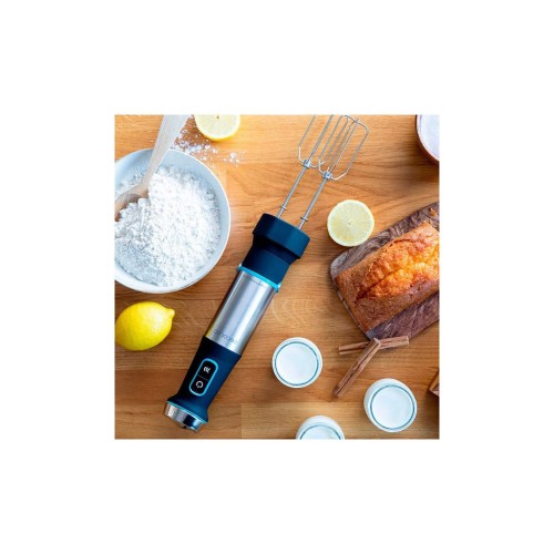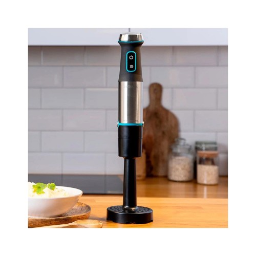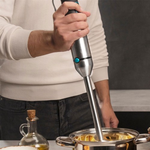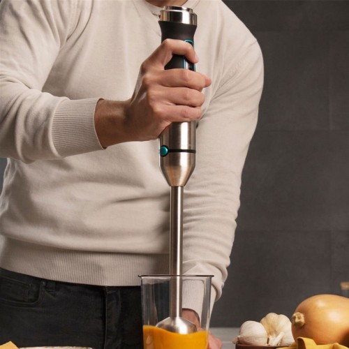 Особливо зручними є додаткові ємності: мірний стакан об'ємом 0.8 л та міні-подрібнювач на 600 мл із захистом від бризок, що дозволяють готувати та зберігати страви без зайвих зусиль. Довга металева ніжка забезпечує ефективність як у широких каструлях, так і в високих склянках, досягаючи кожного куточка для якісного подрібнення та змішування.