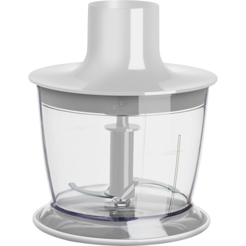 У комплекті є практичний подрібнювач об'ємом 500 мл, оснащений лезами із нержавіючої сталі. Він легко справляється із твердими продуктами, тому він підходить для подрібнення м'яса, сиру, овочів, горіхів і навіть може подрібнювати лід.