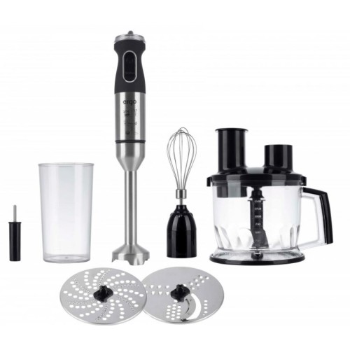 Завдяки погружной конструкції, блендер ERGO EHB 7500 - універсальний кухонний прилад, який має широкий спектр функцій. Металева насадка дозволяє занурювати блендер навіть в киплячу середу для приготування, наприклад, крем-супів. Віночок для збивання допоможе приготувати ніжний омлет або збити тісто. Об'ємна чаша разом з двома металевими дисками для подрібнення і шинкування допоможуть швидко обробити практично будь-які м'які і тверді продукти.