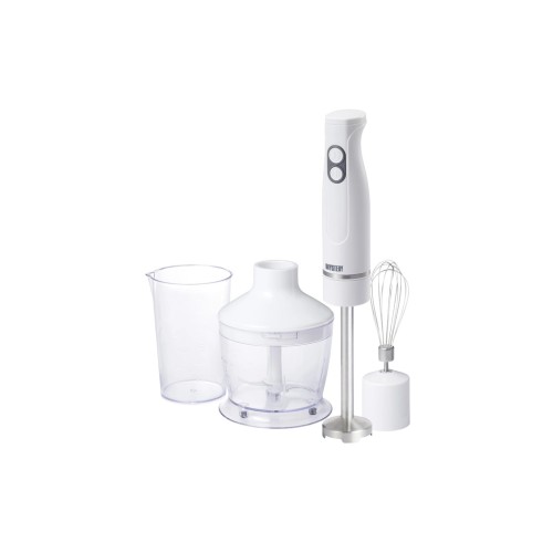 Блендер комплектується рядом практичних аксесуарів, серед яких мірний стакан на 0.5 л та міні-подрібнювач об’ємом 500 мл. Це дозволяє легко вимірювати та готувати інгредієнти без зайвого клопоту. Додатково, насадка-вінчик та насадка-блендер надають можливість швидкого збивання чи ретельного перемішування.