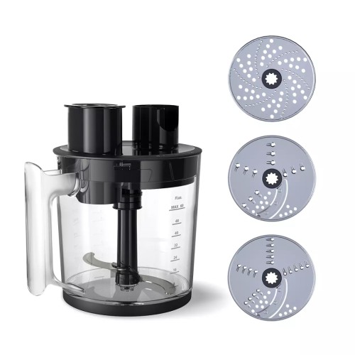 Блендер оснащено потужним подрібнювачем великої місткості об'ємом 1,7 літра, що робить його ідеальним для приготування страв для великої родини. Разом із S-подібним лезом для подрібнення, три додаткові насадки — тертка, вінчик і блендерна насадка — дозволяють експериментувати з різноманітними текстурами та стравами. Компактний подрібнювач об'ємом 500 мл стане в нагоді для нарізання дрібніших порцій інгредієнтів, таких як зелень або горіхи.