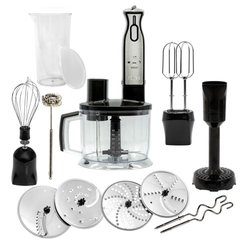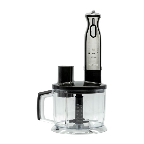 Живлення - 220-240В, 50Гц, Потужність 800 W. 2 швидкісні режими роботи. Регулятор швидкості корпусу. Ножі чотирипелюсткові з нержавіючої сталі. Пластиковий корпус зі знімною ногою. Ноги з нержавіючої сталі. Підвісна петля. Аксесуари: чаша з подрібнювачем 1,75 л, мірна склянка 0,6 л, Віночок з нержавіючої сталі, Диск-терка для дерунів, Диск двосторонній для грубої нарізки та подрібнення овочів та фруктів, Диск двосторонній для дрібного нарізування та подрібнення овочів та фруктів, Диск для нарізки соломкою, насадка для пюре, Насадка-міксер, Насадка для замісу, Спінювач молока.