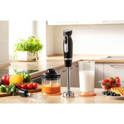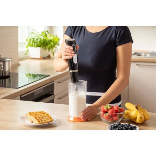 Комплектація блендера справді вражає: в комплекті ви знайдете мірну склянку об'ємом 0.7 л, яка стане чудовим помічником для приготування коктейлів, соусів чи крем-супів. Насадка-вінчик дозволяє збивати вершки, майонез чи яєчні білки до ідеальної консистенції, в той час як насадка-блендер впорається з будь-якими завданнями на вашій кухні.