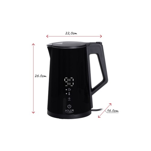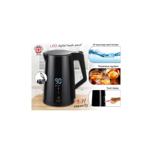 Чайник Adler AD 1345 - багатофункціональний чайник потужністю 1850-2200 Вт та об’ємом 1,7 л. Він підтримує регулювання температури води (40°C/55°C/80°C/90°C/100°C) та підтримку тепла в діапазоні 40-100 °C впродовж 24 годин.