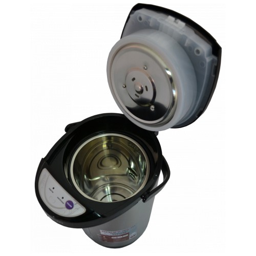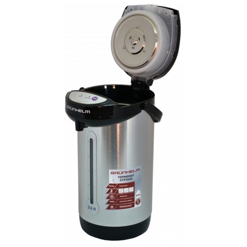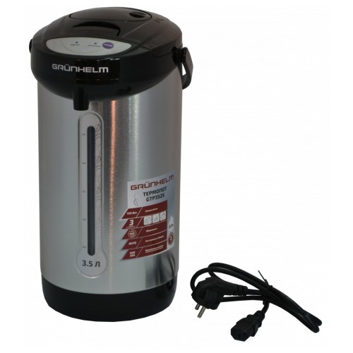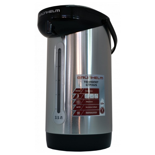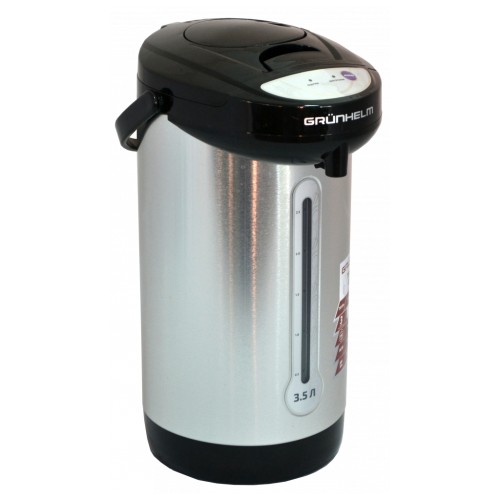 Grunhelm GTP352S – потужний, надійний електричний термопот із корпусом із міцного пластику та нержавіючої сталі. Маючи потужність 750Вт, він за кілька хвилин закип'ятить воду об'ємом до 3,5л, якого вистачає на 10-12 чашок кави або чаю. Пристрій не тільки кип'ятить воду, а й підтримує її температуру, що заощаджує час та електроенергію на нагрівання води з початку. Є шкала рівня води та світловий індикатор включення, а також блокування від включення термопоту без води. Внутрішня ємність виготовлена ​​із харчової нержавіючої сталі. Термопот Grunhelm GTP352S має зручну ручку для транспортування та три способи дозування води за допомогою електричної помпи, сенсорної склянки або ручного насоса. Усі вище перелічені якості роблять покупку даного пристрою розумним та економічним рішенням.