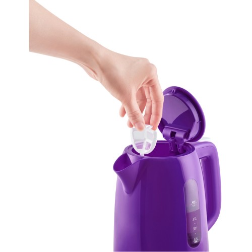 Електрочайник потужністю 2200 Вт об'ємом 1 л. Корпус виготовлений із пластику. Оснащений автоматичним відключенням, блокуванням включення без води, фільтром проти накипу, функцією обертання на 360 °.
