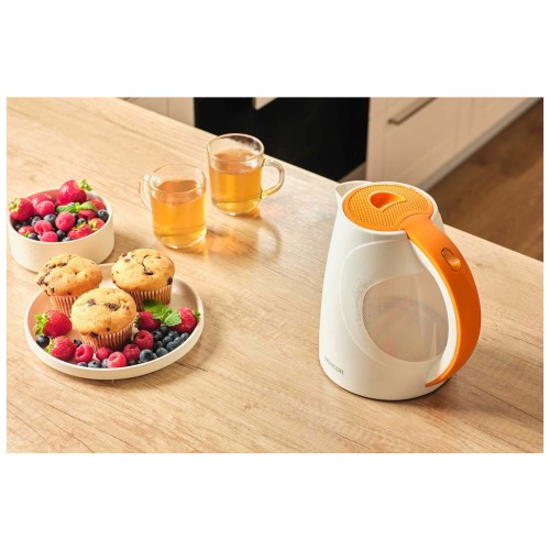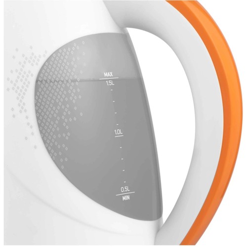Електрочайник потужністю 2200 Вт з об’ємом 1,5 л, виконаний із пластику в білому та помаранчовому кольорах. Оснащений фільтром проти накипу та підставкою з можливістю обертання на 360°, що забезпечує зручність у користуванні.