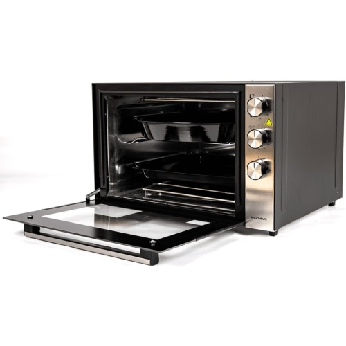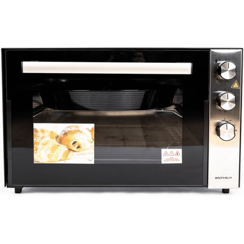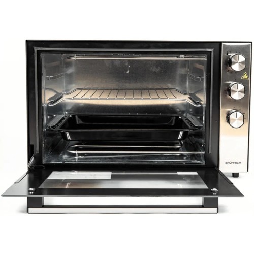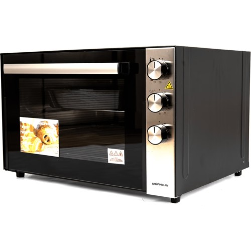 Електрична піч Grunhelm GN70KASС виконана у корпусі чорного кольору. Потужність пристрою становить 2500 Вт, а ступінь нагрівання встановлюється плавним регулюванням. У 70-літровій камері моделі встановлені гриль та конвекційний вентилятор. Функція гриль утворює на продуктах хрумку ароматну скоринку.