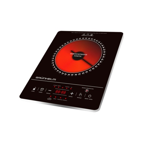 Сучасна настільна плита інфрачервона Grunhelm GIR-809 на 1 конфорку із сенсорним керуванням. Поверхня — пластина Black Crystal, модель має 8 температурних режимів, 8 рівнів потужності та 5 автоматичних програм.
