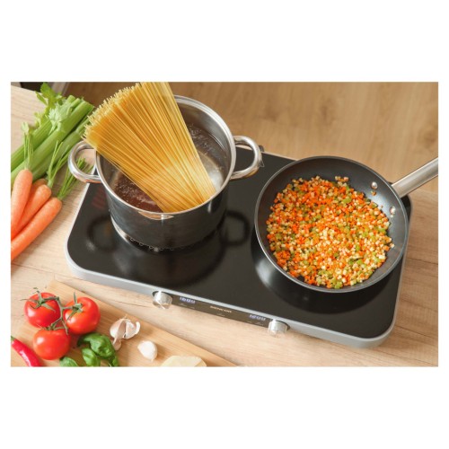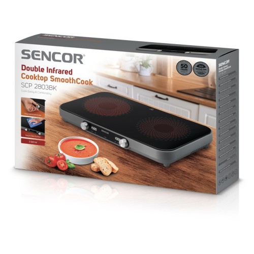 SCP 2803BK SmoothCook пропонує високу продуктивність двох 20-сантиметрових конфорок зі склокераміки. Готує швидко, має змінне регулювання із кроком 100 Вт. На дисплеї кожної конфорки відображається поточна вихідна потужність, яку легко встановити та змінити за допомогою хромованих ручок. Він оснащений пристойним дисплеєм, призначеним для передачі всього важливого, не заважаючи при цьому. Таймер легко встановлюється в діапазоні від однієї хвилини до трьох годин. Технічне обслуговування також не викликає проблем – монолітна верхня кришка легко миється. Монолітна поверхня плити також забезпечує більшу безпеку, а стійкість посуду на цій варильній панелі набагато вища, ніж у багатьох стандартних конфорок.