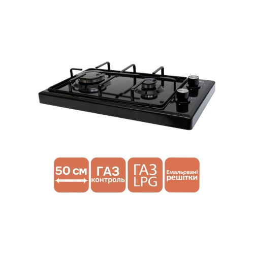 Плита настільна виготовлена з емальованої сталі чорного кольору, який є одним з найбільш універсальний для інтер’єрів. Саме тому плитка прекрасно підійде навіть для квартири. На робочому столі розміщенні дві газові конфорки – 0,9 кВт та 1,75 кВт. Цієї потужності вистачить і для розігріву їжі, і для приготування з нуля.