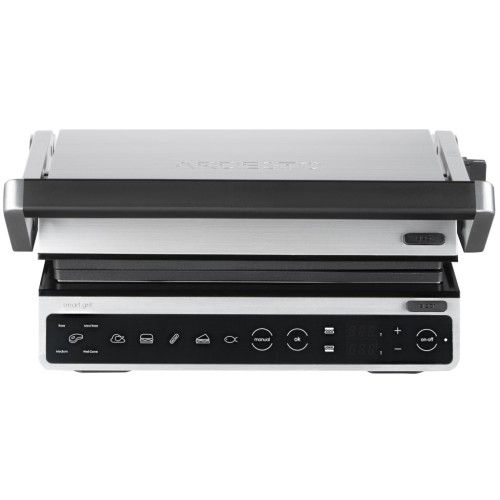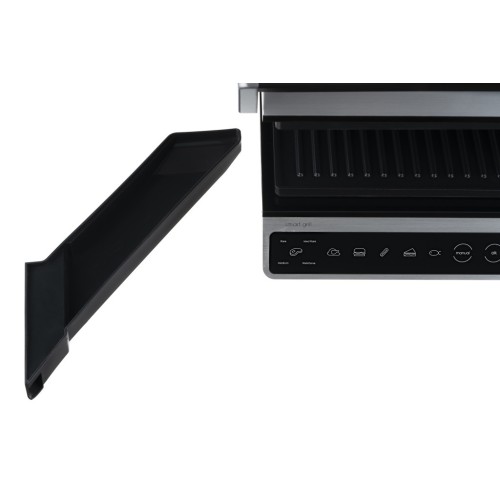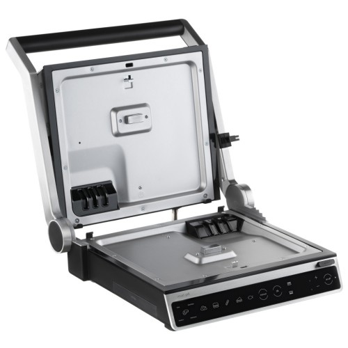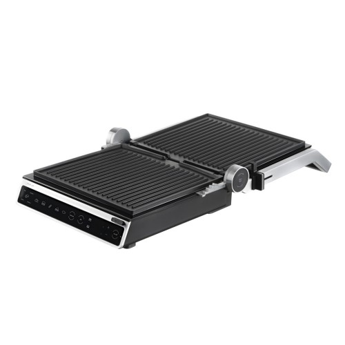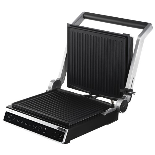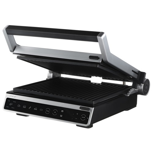 Електрогриль з потужністю 2000 Вт, сенсорним керуванням, шістьма автоматичними режимами приготування, регулюванням температури та ступеня готовності, а також автоматичним визначенням товщини продукту. Повне відкриття конструкції дозволяє використовувати обидві поверхні одночасно, з окремою установкою температури для кожної пластини. Знімні пластини з антипригарним покриттям та лоток для збору жиру забезпечують зручне та просте очищення.