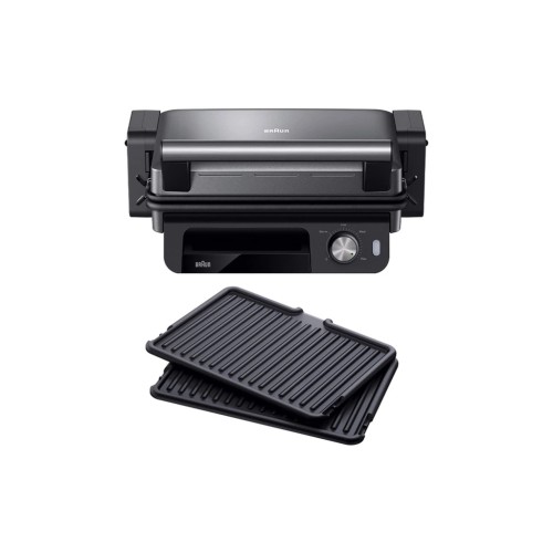 У комплект входять дві змінні пластини-гриль і піддон для збору жиру, які можна мити в посудомийній машині. Завдяки регульованому термостату легко обрати відповідну температуру для кожної страви. А вбудована кнопка блокування надійно фіксує пристрій, забезпечуючи зручність використання та безпеку під час зберігання. Стильний дизайн і функціональність роблять цей гриль чудовим помічником на вашій кухні.