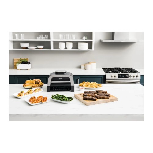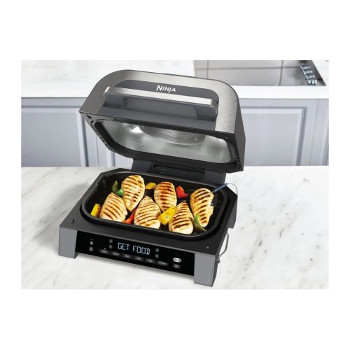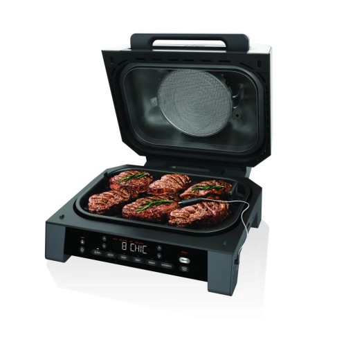 Втомилися від тривалого приготування їжі та надмірної кількості олії? Тепер можна готувати швидко, зручно й отримувати більш здоровий раціон! Гриль Ninja Foodi MAX Air Grill & Air Fryer з Cooking probe DG551EU оснащений 6 функціями приготування — смаження, гриль, дегідратація, запікання, аерофритюр і розігрівання. Навіть новачки зможуть готувати смачні страви ресторанного рівня. Технологія Cyclonic Grilling з гарячим повітрям до 265°C рівномірно обсмажує зі хрусткою скоринкою та насиченим ароматом. А система Smart Cook і розумний термощуп дозволяють досягти ідеального результату з 4 режимами для різних видів м’яса і 9 рівнями просмаження. Знижуйте споживання олії на 75% і отримуйте страви зі зменшеною калорійністю. Приготування заморожених страв потребує лише 25 хвилин з високою потужністю 1760 Вт. Ідеальна система контролю диму дозволяє залишати кухню чистою, а керамічне покриття легко очищується навіть у посудомийній машині. Додайте приготуванню улюблених страв професійного рівня з грилем Ninja Foodi MAX!