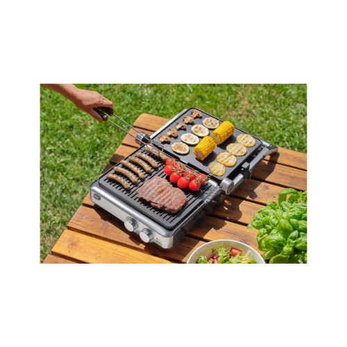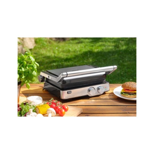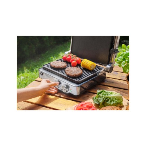 Універсальний електричний контактний гриль Sencor SBG 4010SS - ідеальний помічник для щоденного приготування грилю вдома та на вулиці. Він включає знімні пластини для гриля з антипригарною поверхнею для досягнення найкращого результату при приготуванні соковитого стейку, сосисок, риби або овочів і фруктів. Гриль можна відкрити та смажити на подвійній поверхні. Зайвий жир від приготування зливається прямо у спеціальну ємність, що робить приготування на грилі кориснішим. Крім того, робота з грилем Sencor дуже безпечна завдяки поверхні CoolTouch, яка теплоізольована та прохолодна на дотик.