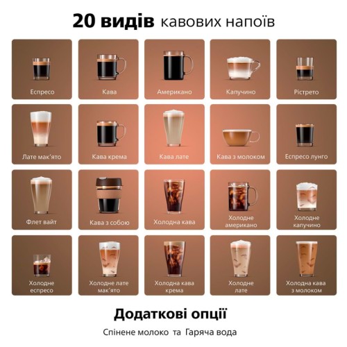 рістретто; американо; еспрессо; латте; латте макіато; капучино; флет уайт; кава лунго; кава з молоком; гаряча вода; холодні напої; молоко; кава крема