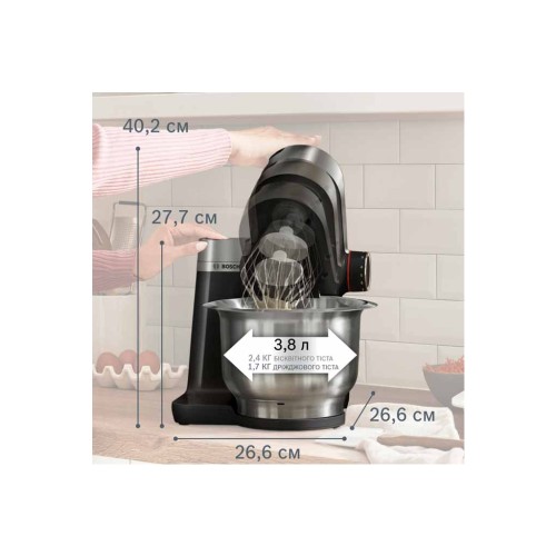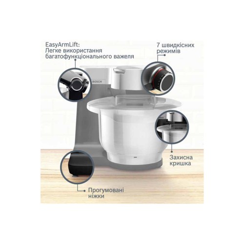• Потужний мотор Bosch 900Вт: ідеально підходить для швидкого випікання та приготування, легкої обробки навіть важкого тіста