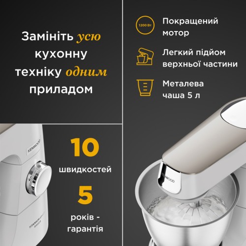 KVC65.001WH — це неймовірна кухонна машина, яку будь-який кондитер хотів би побачити на своїй кухні. На додаток до інновацій і вдосконаленого дизайну лінійки продуктів Kenwood Chef, Titanium Chef Baker забезпечує бездоганну роботу на кожен день і для будь-яких завдань.
