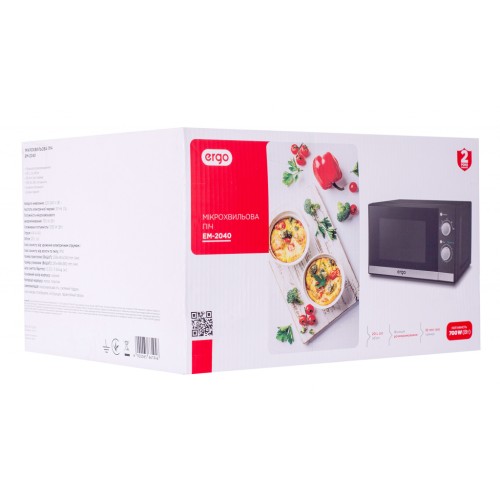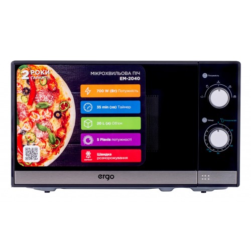 Мікрохвильова піч ERGO ЕМ-2040 - зручний і функціональний помічник на офісній або домашній кухні. Зрозуміле механічне керування сподобається поціновувачам простих, але надійних речей, а корпус чорного кольору - тим, кому важливий стиль.