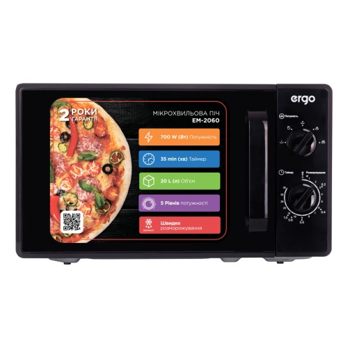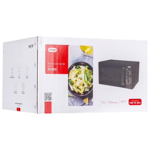 Потужності в 700 Вт досить для рівномірного розігріву, готування або швидкого розморожування. Крім цього, мікрохвильовка ERGO EM-2060 має функцію «Меню автоматичного приготування», яка дозволяє готувати різноманітні страви легко і без зайвих зусиль.