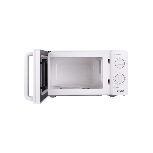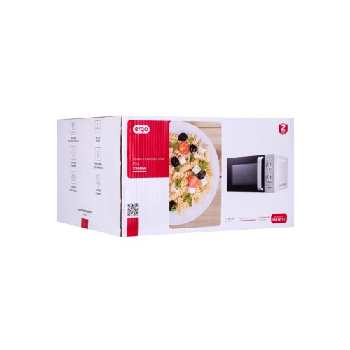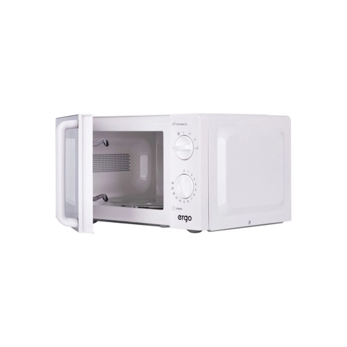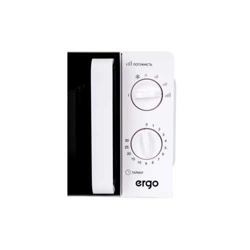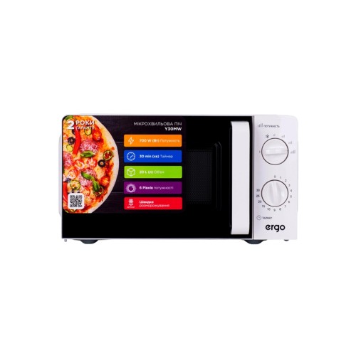 ERGO Y30MW — це мікрохвильова піч білого кольору з практичним дизайном. Стане у пригоді для швидкого приготування страв та розігрівання продуктів. Потужності в 700 Вт досить для точного контролю рівномірного розігрівання та розморожування в 6 режимах. Мікрохвильова піч досить містка, адже має об'єм 20 літрів. Механічне керування робить її простою у користуванні. Завдяки функції таймера, після закінчення встановленого часу, пристрій автоматично зупинить свою роботу та сповістить Вас про готовність страви. Максимальний час таймера становить 30 хвилин. Поворотний стіл забезпечує рівномірне розігрівання їжі з усіх сторін. Всередині піч покрита емаллю, тому Ви зможете легко очистити її від забруднень. Мікрохвильова піч ERGO Y30MW стане незамінним помічником на Вашій кухні.