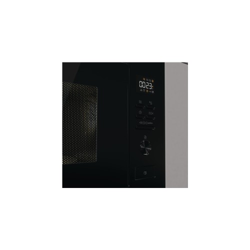 Модель розрахована на об’єм 25 літрів і оснащена скляною поворотною тарілкою діаметром 315 мм, що забезпечує рівномірний розподіл мікрохвиль. Робоча камера виготовлена з нержавної сталі, що сприяє довговічності та полегшує догляд. Панель керування виготовлена з пластику з імітацією скла, що гармонійно доповнює загальний стиль пристрою.