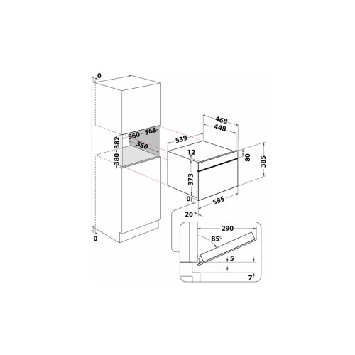 Габарити мікрохвильової печі становлять 38.5 × 59.5 × 46.8 см, а для вбудовування потрібна ніша розміром 38–38.2 × 55.6–56.8 × 55 см. Серед додаткових функцій передбачені автоматичне приготування, автоматичний розігрів, розморожування за вагою, хрумкий розігрів, таймер відтермінування старту та захист від дітей.