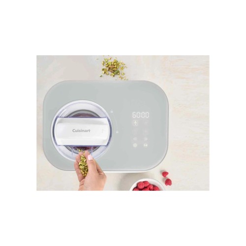 Спеціальний завантажувальний отвір у прозорій кришці дає змогу додавати улюблені інгредієнти — шоколадні крихти, горіхи або свіжі фрукти — безперервно під час приготування. Для зручності передбачена сенсорна панель із чотирма автоматичними програмами: морозиво, сорбет, заморожений йогурт та підтримка холоду. Ви також можете регулювати час приготування вручну за допомогою кнопок +/−.