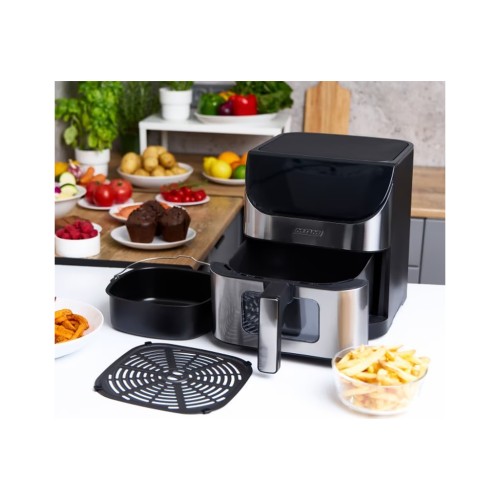 Хочете швидко приготувати смачне блюдо для всієї родини? Кошик у фритюрниці знежиреної ємкістю 6 л дозволяє готувати більше страв одночасно. Це особливо корисно під час приготування їжі для великої групи людей або організації вечірок. Великий кошик також дозволяє готувати більші шматки м'яса, овочів або інших інгредієнтів нестандартних розмірів. Вам не доведеться турбуватися про те, що ваша їжа підгорить, внутрішня частина кошика покрита антипригарним покриттям, що також полегшує очищення. Ви можете стежити за всім процесом приготування завдяки віконцю, розміщеному в кошику, і освітленій внутрішній частині. У комплект також входить форма для запікання з ручкою об'ємом 2.3 л.
