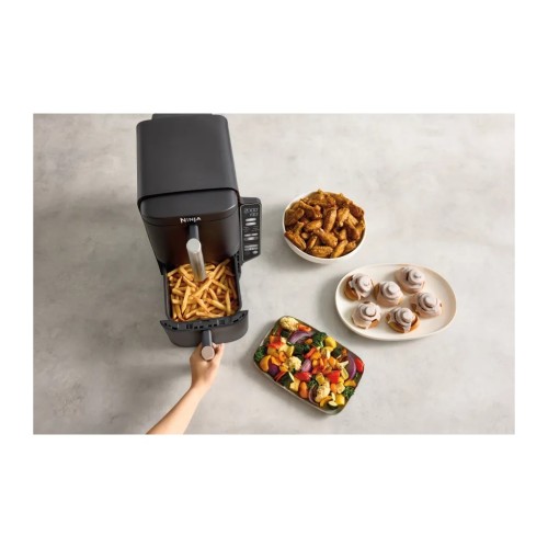 Мультипіч Ninja Double Stack 2-Level Air Fryer 7,6 л — справжня знахідка для тих, хто хоче поєднати смачне з корисним і заощадити час і простір на кухні. Завдяки загальному об'єму 7,6 л з двома незалежними кошиками на 3,8 літра кожен ви зможете одночасно приготувати вечерю для всієї родини на 6 осіб. Чи то соковиті стейки з хрусткою скоринкою, чи запечені овочі, чи навіть свіжоспечений хліб — мультипіч підлаштується під будь-який кулінарний задум. Основний секрет моделі полягає в технології Double Stack Pro, яка дозволяє використовувати чотири рівні для приготування та створює умови для рівномірного нагрівання з мінімумом олії. Уявіть, як зручно готувати одразу дві страви завдяки функціям SYNC і MATCH, коли ви одночасно підсмажуєте картоплю фрі й запікаєте курку до золотистої скоринки. Технології автоматично підлаштовують час і температуру під кожен продукт. Усі знімні частини мають антипригарне покриття, тож ви зможете легко мити кошики та решітки в посудомийній машині.