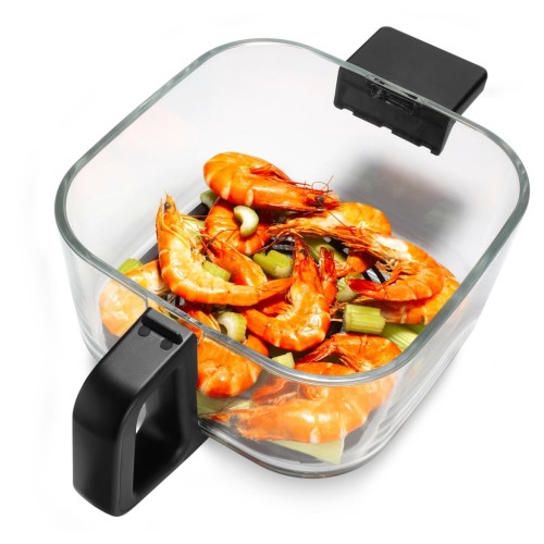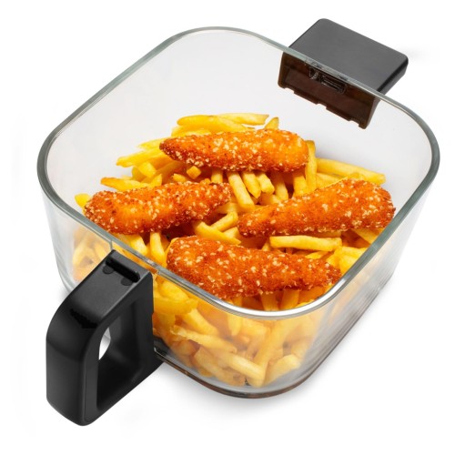 Ємність для смаження має великий об'єм 5,5 літрів, що ідеально підходить для великих сімей. Аєрофритюрниця оснащена сенсорним світлодіодним дисплеєм, який дозволяє легко вибирати попередньо встановлені програми, такі як функція розморожування або виставляти ручні налаштування. Діапазон температур від 40 до 200°C пропонує широкий спектр можливостей для приготування різних рецептів, а завдяки прозорій чаші на 360° ви можете впевнено готувати різні види м’яса, риби, сиру або навіть десерти.