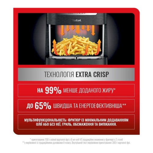 Технологія Extra crisp пропонує ідеальний баланс температури і потоку гарячого повітря для отримання хрусткої золотистої скоринки з невеликим додаванням олії або без додавання олії - насолоджуйтесь приготуванням з додаванням на 99% менше олії, ніж при звичайній смаженні! На 99% менше додавання олії: 700 г свіжої картоплі фрі, приготованої з 8 мл олії, в порівнянні з традиційною жаркою з 2 л олії.