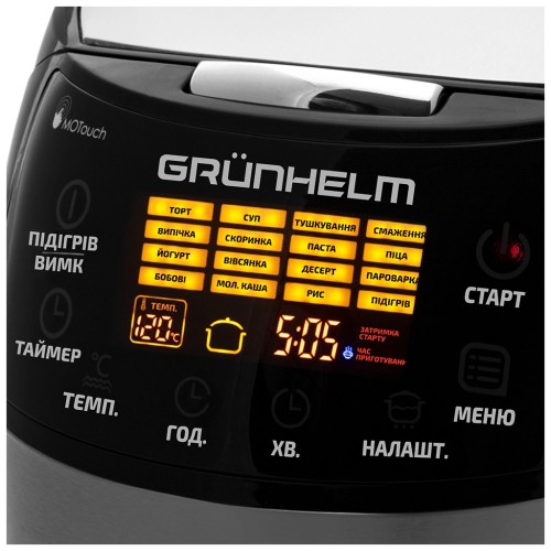 Приготування в мультиварці GRUNHELM MC-16T автоматизоване, завдяки чому можна готувати страви з м'яса, птиці, риби, морепродуктів, вегетаріанську їжу, варити каші, супи, гарніри, спагетті, плов, смажити у фритюрі, робити йогурти, випікати десерти, компоти та багато іншого.
