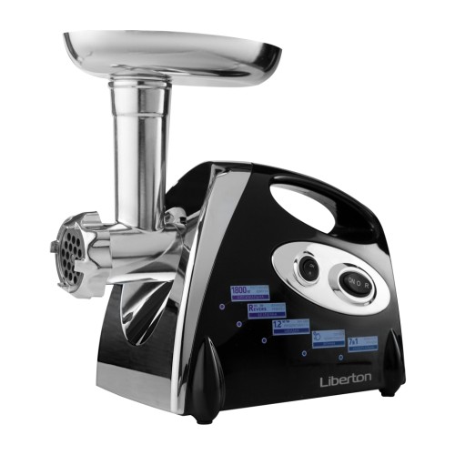 Потужність: 1800 Вт (при заклинюванні); Продуктивність: 1,2 кг/хв.; Функції: реверс, захист від перегріву; Аксесуари: 3 диска для помелу (3 мм/5 мм/7 мм), насадка для ковбас, насадка для кебе, соковитискач для томатів, штовхач, металевий лоток; Матеріал шнека: нержавіюча сталь; Матеріал корпусу: пластик; Розмір виробу: 28х18,5х23 см; Колір: чорний+срібло.