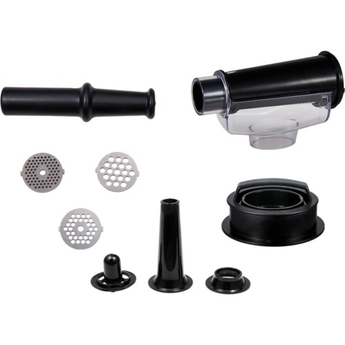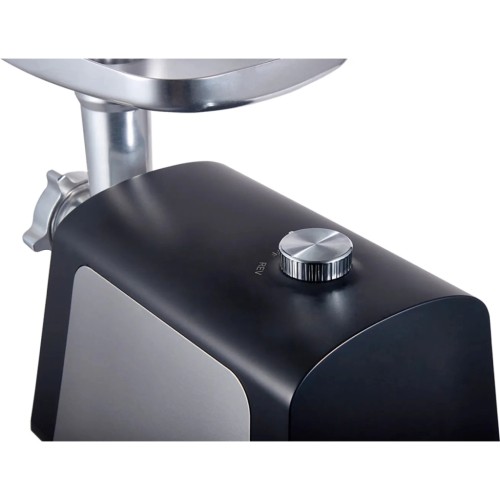 Потужність: 2800 Вт (при заклинюванні); Продуктивність: 2.0 кг/хв.; Функції: реверс, захист від перегріву; Аксесуари: 3 диска для помелу (3 мм/5 мм/7 мм), насадка для ковбас, насадка для кебе, соковитискач для томатів, бургер-прес, штовхач, металевий лоток; Матеріал шнека: нержавіюча сталь; Матеріал корпусу: нержавіюча сталь; Розмір виробу: 24,8х15,6х23,8 см; Колір: нерж+чорний.