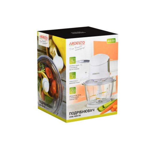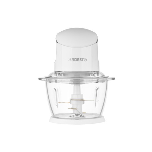Компактний чоппер білого кольору для швидкого подрібнення інгредієнтів та приготування різноманітних соусів. У комплектацію входить скляна чаша та подвійні ножі.