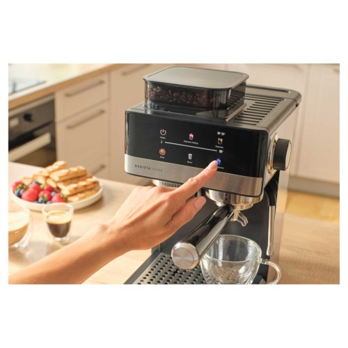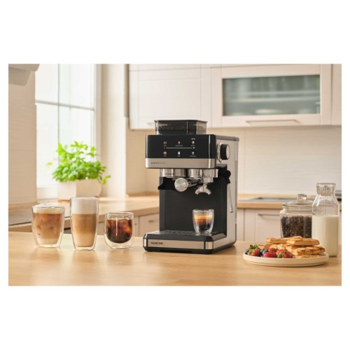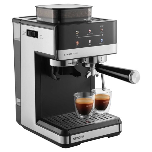 Кавоварка Sencor створена для приготування еспресо з меленої або зернової кави завдяки вбудованій металевій кавомолці. Система Thermoblock забезпечує стабільну температуру, а тиск 20 бар сприяє насиченому смаку напою. Сенсорний дисплей із кольоровими піктограмами полегшує керування режимами. Модель оснащена підігрівачем чашок, обертовою паровою насадкою та автоматичним вимкненням.