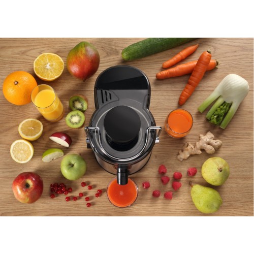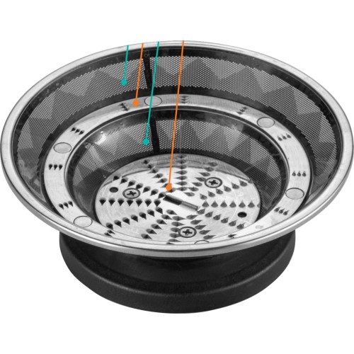 Підвищена ефективність вичавлювання соку завдяки пропусканню фруктів та овочів через спеціально розроблений фільтр. Фрукти перетирають на решітці для подрібнення та виділення соку. М'якуш, який залишається, проходить через ще одну решітку і сітку, а потім відкладається в окремий кошик.