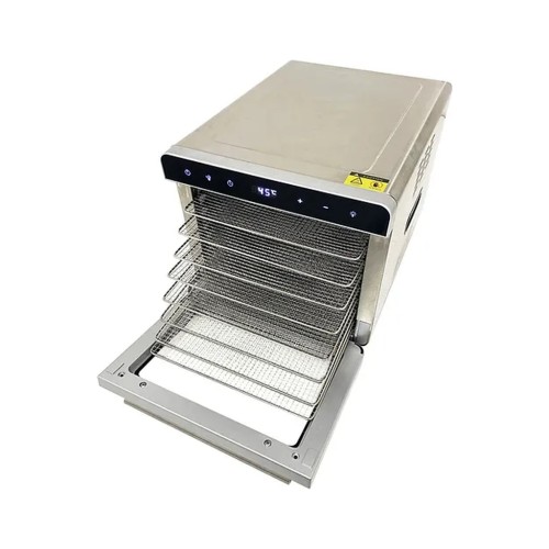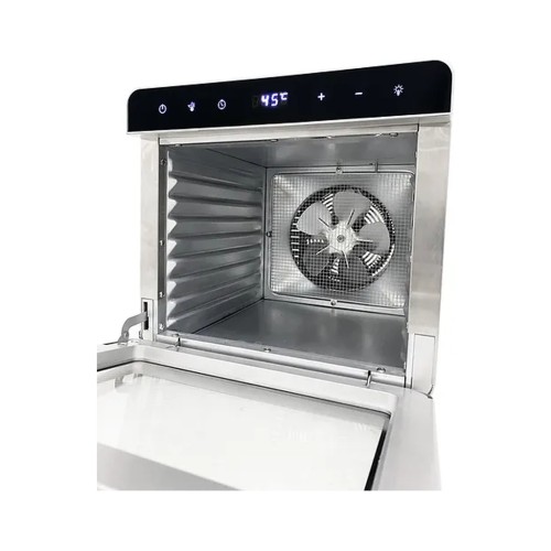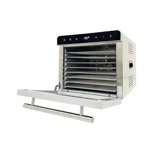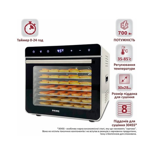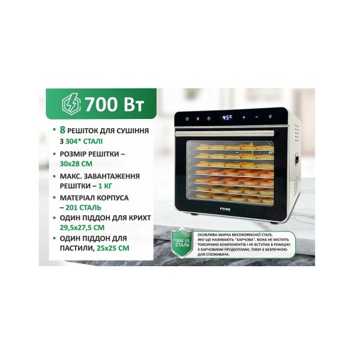 Сушіння для овочів та фруктів, об'єм 19 л, потужність 700 Вт, конвективна система сушіння, електронне управління, 8 секцій, корпус – 304 сталь, терморегулятор 35 - 85 °С, автоматичне відключення, таймер 24 години, вентилятор розташований ззаду, захист від перегріву , колір нержавіюча сталь/чорний.