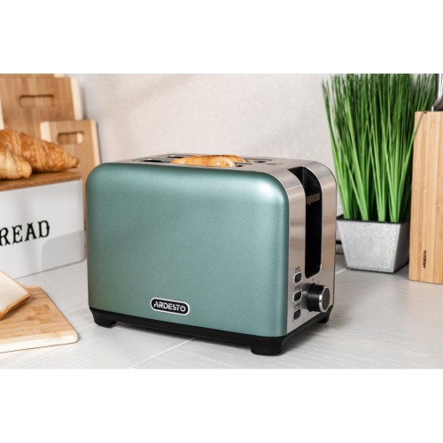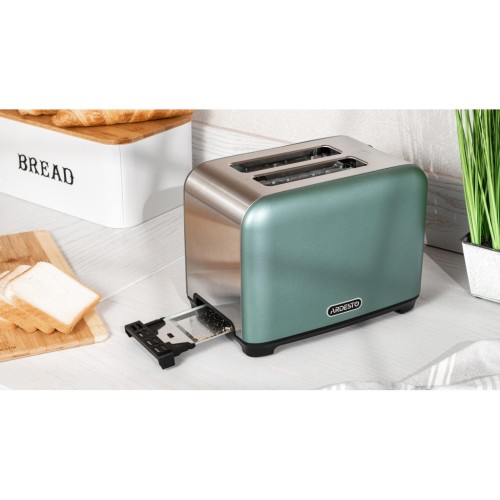 Тостер Ardesto T-F400G виготовлений із нержавіючої сталі з м'ятними вставками. Завдяки інноваціям він стане надійним помічником кожної господині, яка бажає балувати рідних смаколиками. У тостері можна обсмажити відразу два хлібці з обох боків. Ступінь прожарювання – 7 рівнів – можна вибрати за допомогою ручки. Якщо готові тости охолонули, можна скористатися функцією обігріву. При використанні замороженого хліба стане в нагоді функція розморожування.