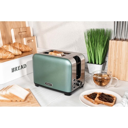 Тостер на дві скибки хліба в корпусі з нержавіючої сталі із чорними вставками. Тостер має функції розморожування, підігріву та автоматичного вимикання.