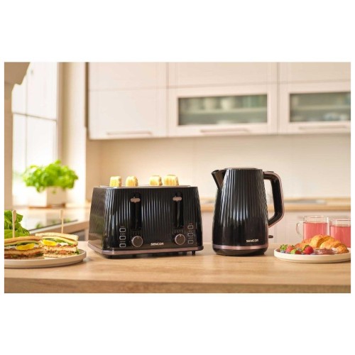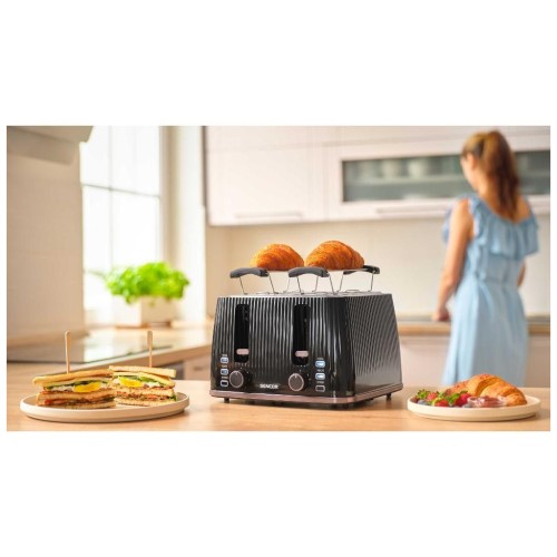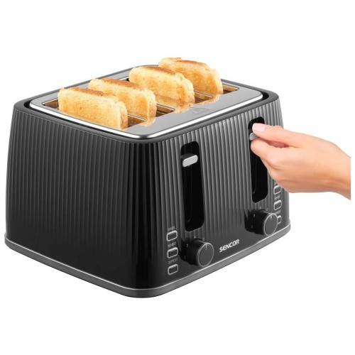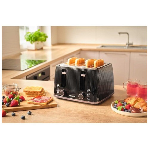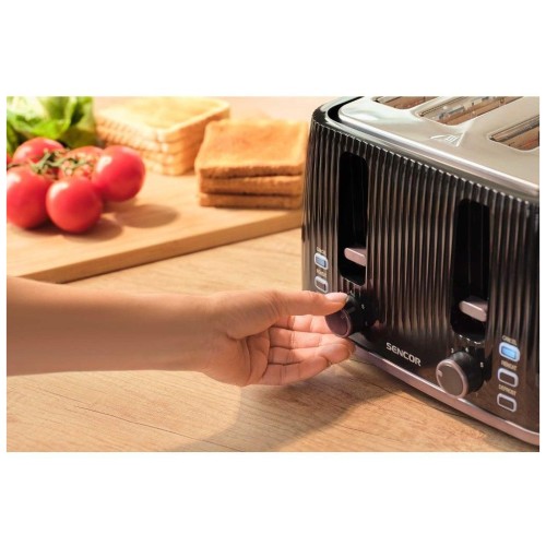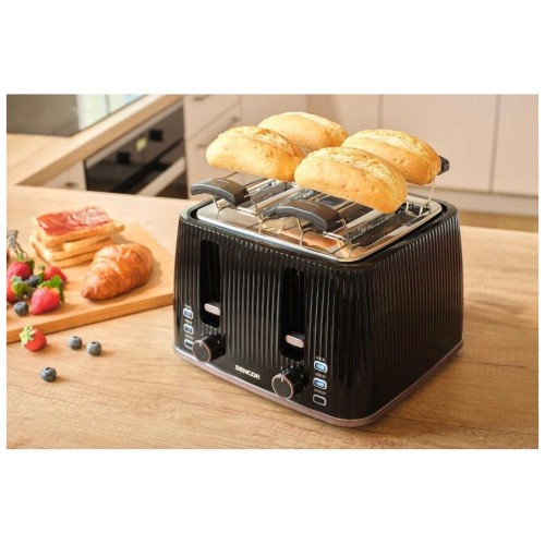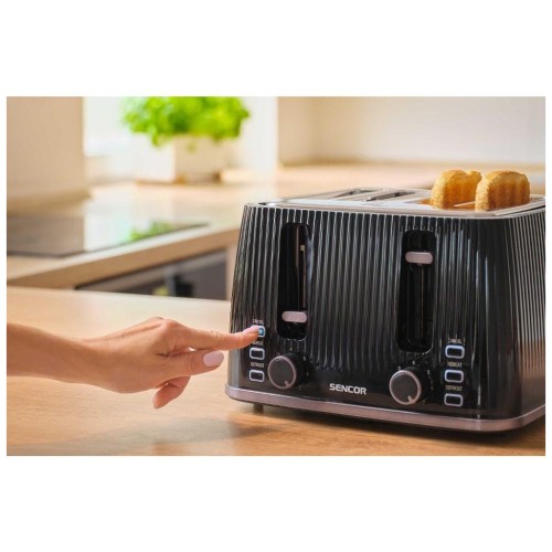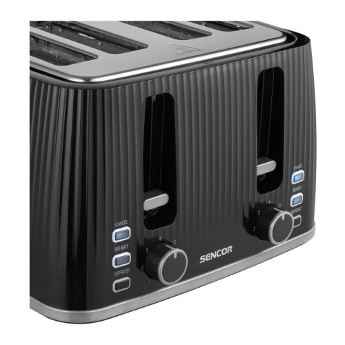 Sencor STS7541BK — потужний 4-слотовий тостер (1860 Вт) з 7 рівнями підсмажування, функціями розморожування, підігріву та миттєвої зупинки. Знімна решітка для булочок, великий піддон для крихт і стильний чорний корпус. Ідеальний для великої сім’ї або офісу — одночасно готує 4 тости.