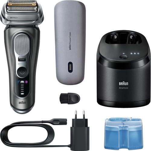 Вміст коробки: 1 бритва Braun Series 9 PRO+, 1 дорожній футляр, 1 зарядний пристрій, 1 щіточка для очищення, 1 футляр PowerCase, 1 центр SmartCare 6-в-1, 1 картридж для догляду за бритвою.