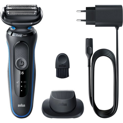 Чоловіча електробритва Braun Series 5 із 3 плаваючими лезами для легкого гоління, яке адаптується до контурів вашого обличчя. Система EasyClean забезпечує швидке та легке очищення, не знімаючи бритвену головку. Літій-іонний акумулятор забезпечує до 3 тижнів гоління та швидко заряджається за 5 хвилин для 1 гоління. Електробритва на 100 % водонепроникна і дозволяє як сухе, так і вологе гоління. Сумісна із EasyClick, щоб розширити можливості вашої бритви.