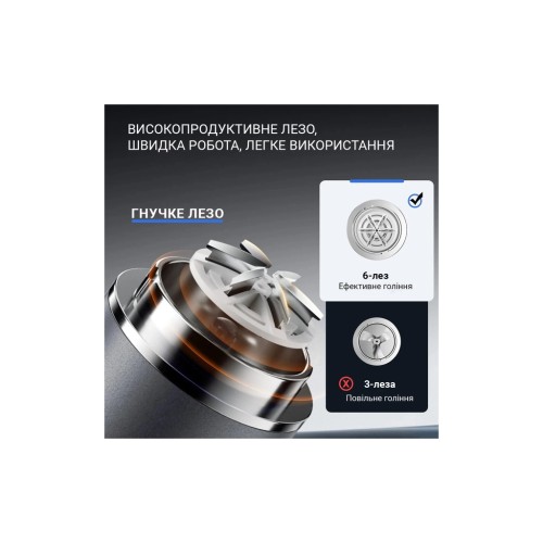 швидке зарядження; очищення під струменем води; водонепроникний корпус; 6 лез