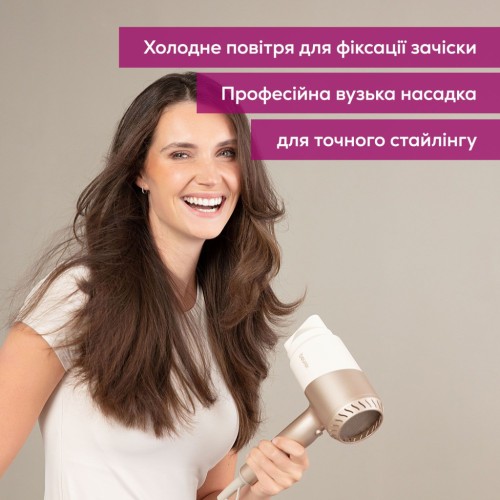 Цей фен вирізняється сучасним і модним дизайном у золотому кольорі, який стане стильним доповненням вашого щоденного ритуалу краси. Він оснащений генератором іонів, що зменшує електризацію волосся, надає йому природного блиску та робить локони гладенькими та м'якими. Іонізація значно покращує якість сушіння та робить волосся доглянутим і захищеним від зовнішніх впливів.